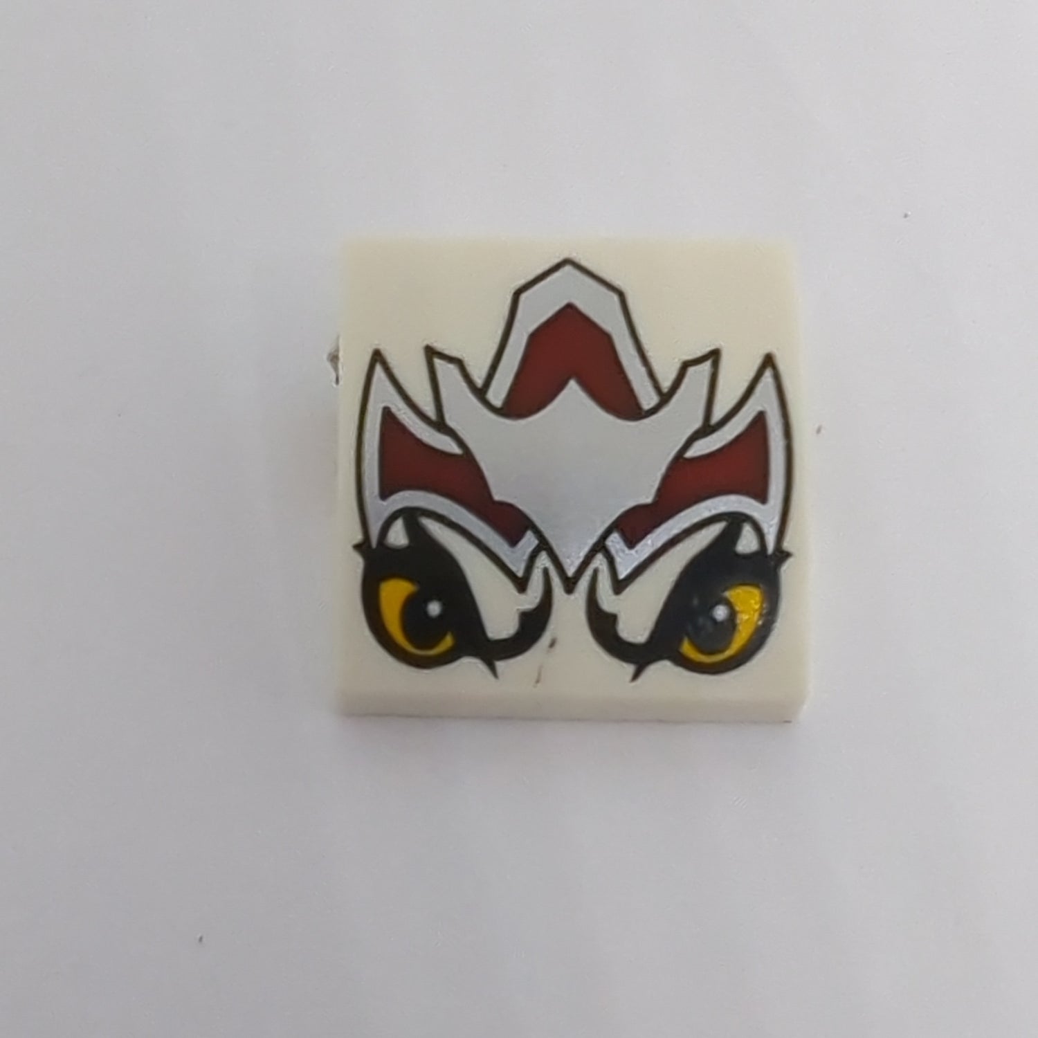 2x2 Halbbogenstein flach keine Noppen mit dunkelroter und silberner Rüstung, leuchtend hellorangefarbenen Augen (Wolf Legend Beast) Muster bedruckt weiss white