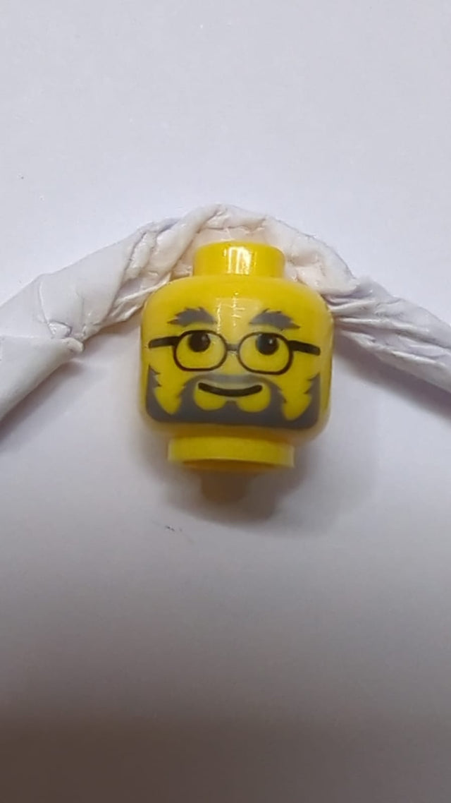 Kopf Dunkelgrau mit buschigen Augenbrauen, dünnem Schnurrbart und Vollbart, Brille mit schwarzem Gestell, Grinsen-Muster gelb