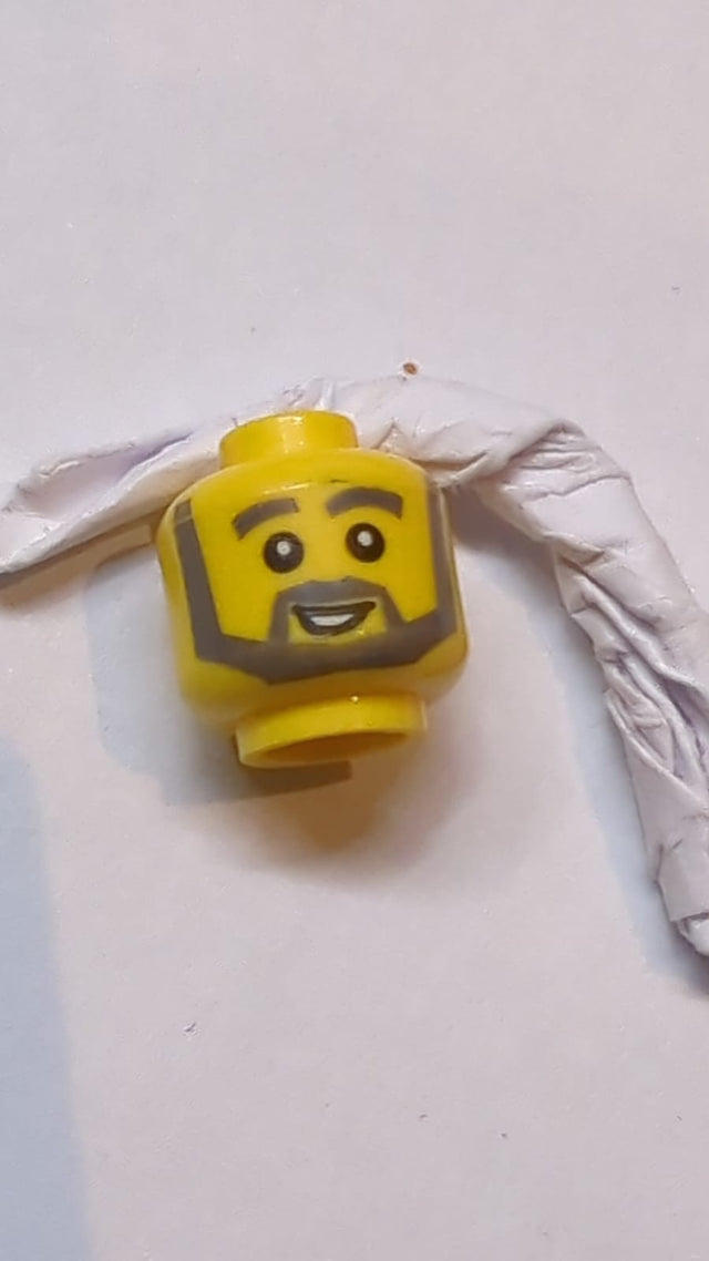 Kopf Dunkelbläulich graue, dicke Augenbrauen, kantiger Bart und dicke Koteletten, schief lachender Mund mit offenem Mund und weißen Zähnen