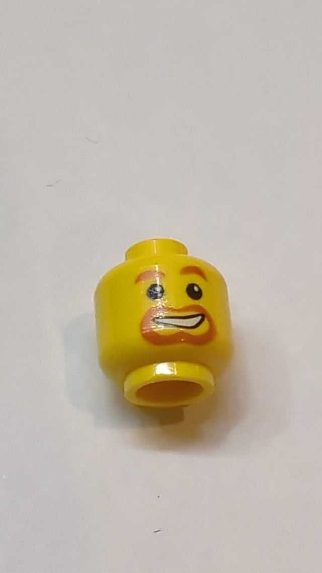 Kopf Dunkelorange, Augenbrauen, Schnurrbart und Spitzbart, schiefes offenes Lächeln mit Zahnstruktur