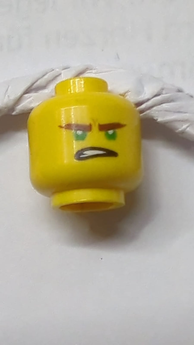 Kopf mit doppelseitigen rötlich-braunen Augenbrauen, grünen Augen, schief geöffnetem Mundgrinsen / zusammengebissene Zähne Muster (Lloyd) gelb
