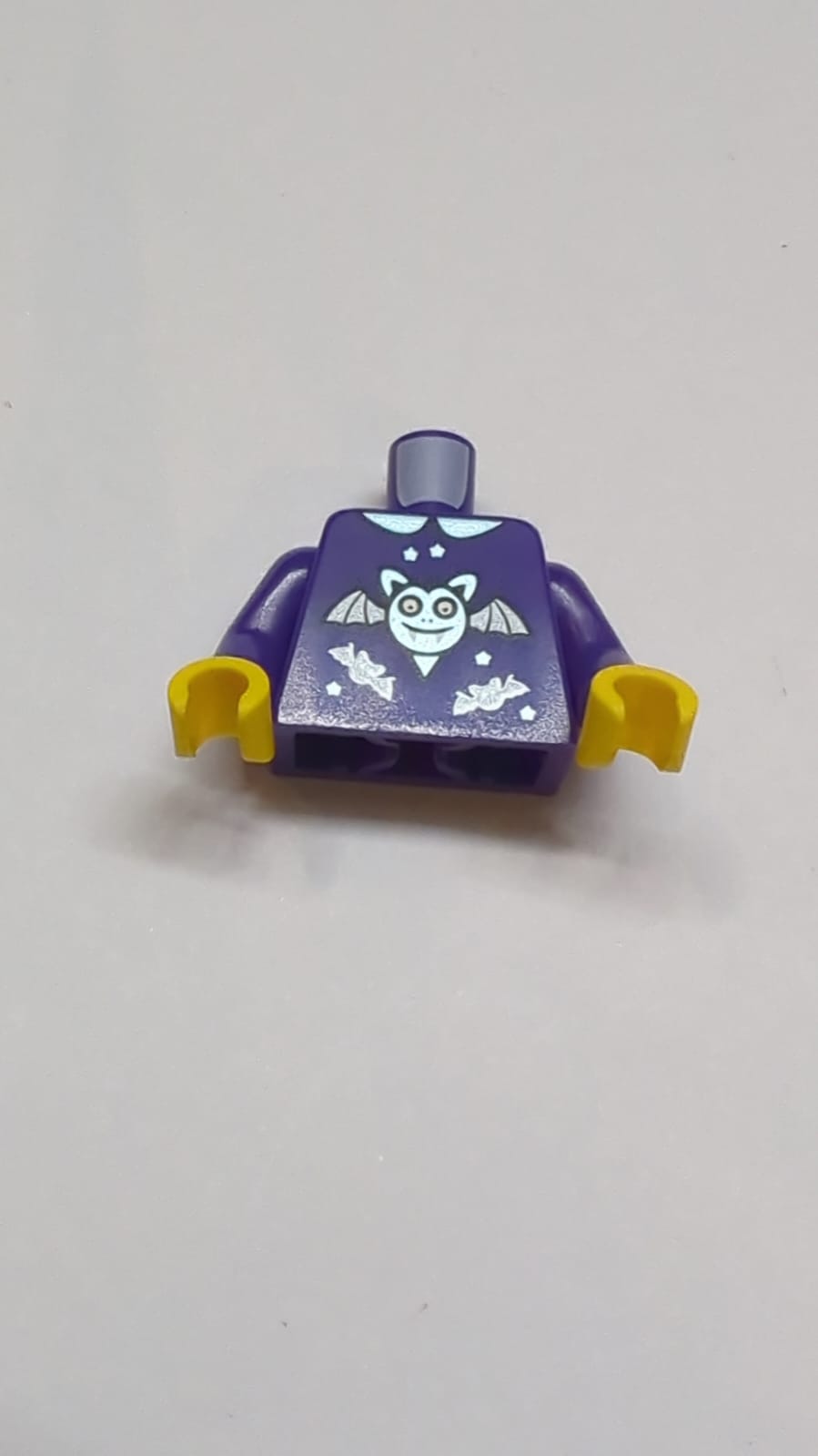 NEU Oberteil mit Kragen, metallisch hellblauer großer Fledermaus mit Grinsen und dunkelsilbernen Flügeln, Muster aus kleinen Fledermäusen und Sternen (BAM) / dunkelviolette Arme / gelbe Hände