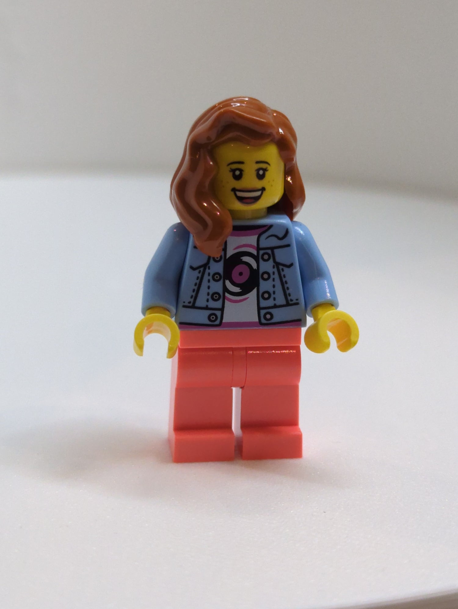 NEU Town Minifigur Musikladen Angestellte - Jeans Jacke , korall Beine, dunkelorangene Haare twn476