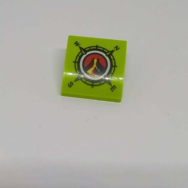 2x2 Halbbogenstein flach keine Noppen mit Volcano Explorers Logo Kompassmuster bedruckt lindgrün lime