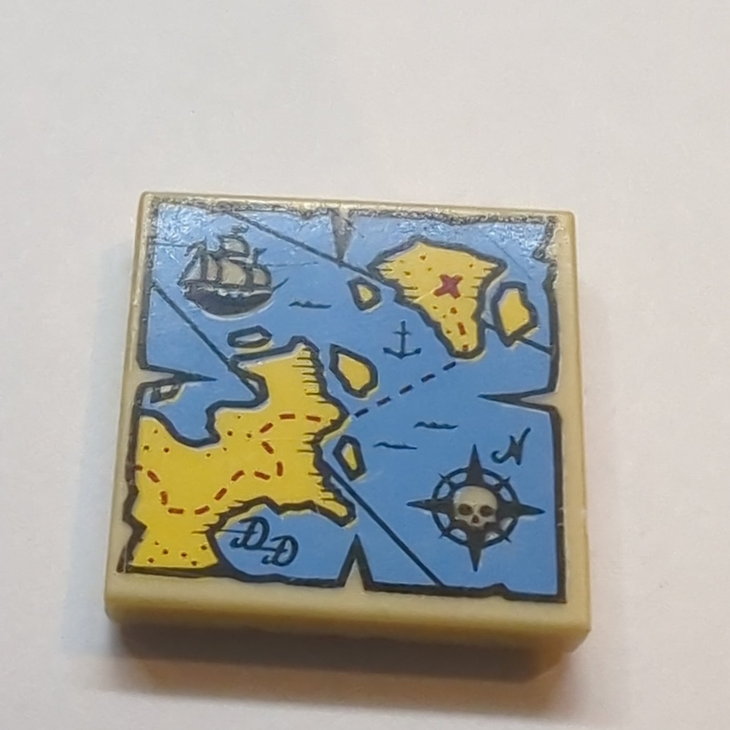 2x2 Fliese bedruckt mit Map Blue Water, Yellow Land, Black Pirate Ship, Compass Rose, White Skeleton Head and Red 'X' Pattern beige tan