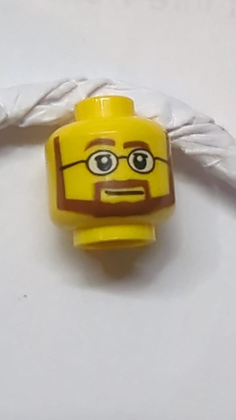 Kopf rötlich-braune Augenbrauen, Schnurrbart und kantiger Bart, obere Augenlider, schwarze Brille mit weißen Gläsern, neutrales Muster gelb
