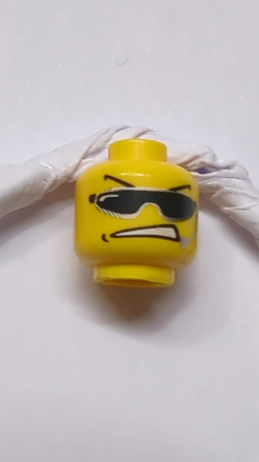 Kopf mit Sonnenbrille, gewölbten Augenbrauen, offenem Mund und Headset-Muster gelb