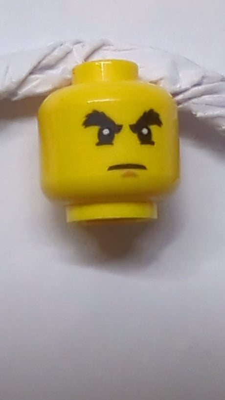 Kopf Schwarze buschige Augenbrauen, Unterlider, mittlere Nougat-Kinngrübchen, strenger Ausdruck gelb