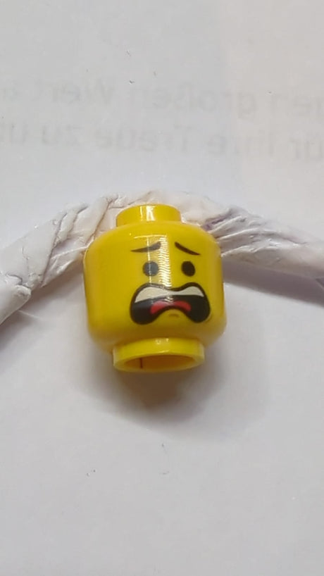 Kopf mit Bart rötlich-braun, rund mit weißen Pupillen und Grin-Muster gelb
